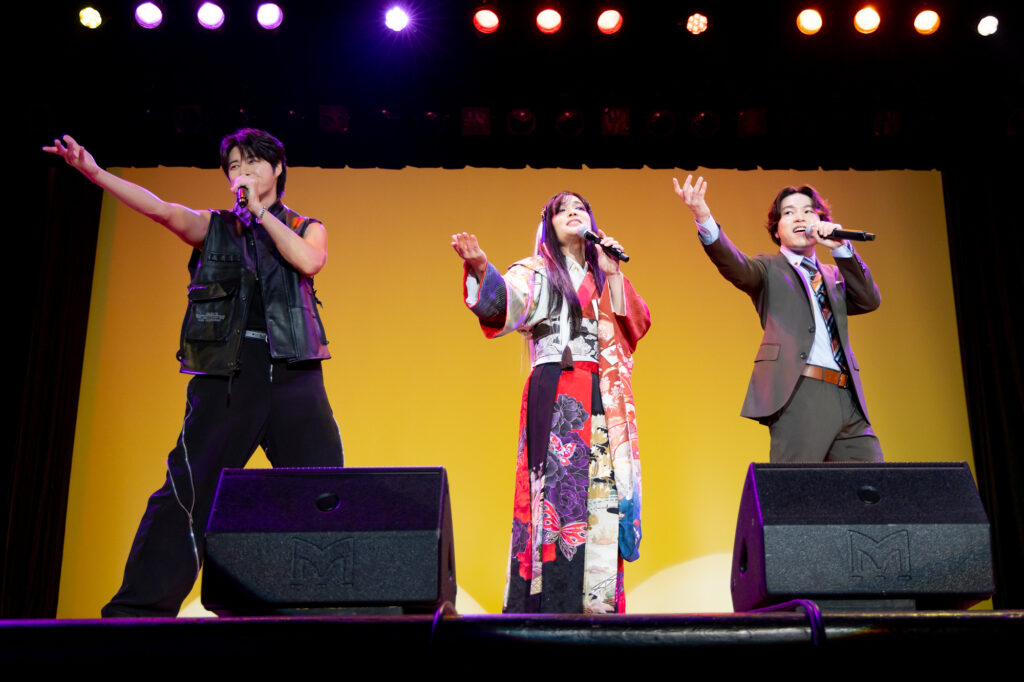 中森明菜の『飾りじゃないのよ涙は』を披露するジュノさん、風水ノ里恒彦さん、牛島隆太さん/写真提供:©DSNL