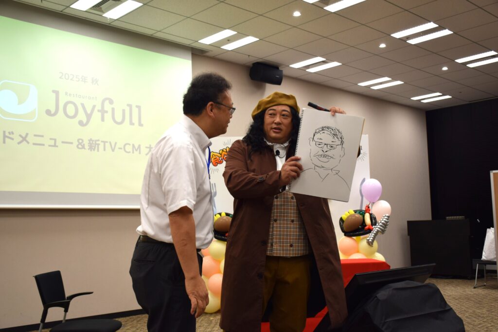 なぜか最後はミュージカル風に歌を歌いながら退場。『ジョイフル』の社員たちを巻き込みながら、カーテンコールさながらに熱くあいさつしました。まさに大暴走な秋山さん劇場でした!