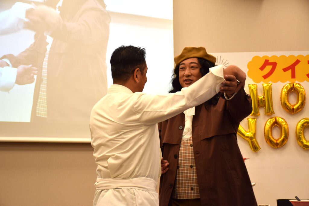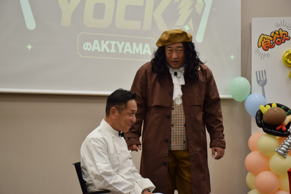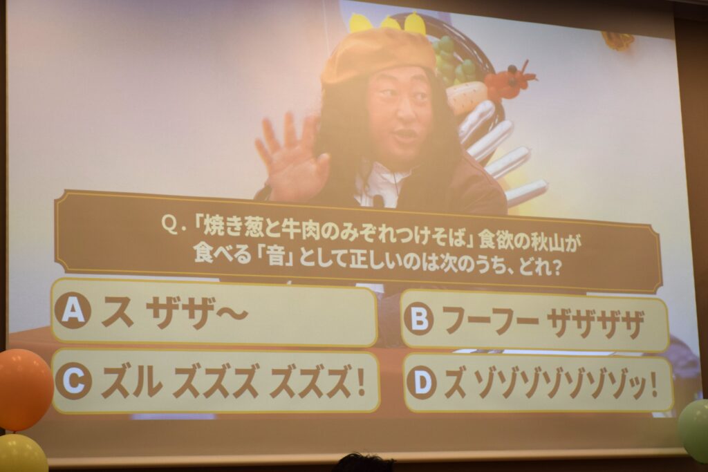 イベントでは、『クイズSHOCK YOCK!のAKIYAMA』という架空のテレビ番組の公開収録という形式で、新メニューに関するクイズを出題。しかし第1問から「(新メニューの)『焼き葱と牛肉のみぞれつけそば』を食欲の秋山が食べる音として正しいのは?」と、難問が出題されました!