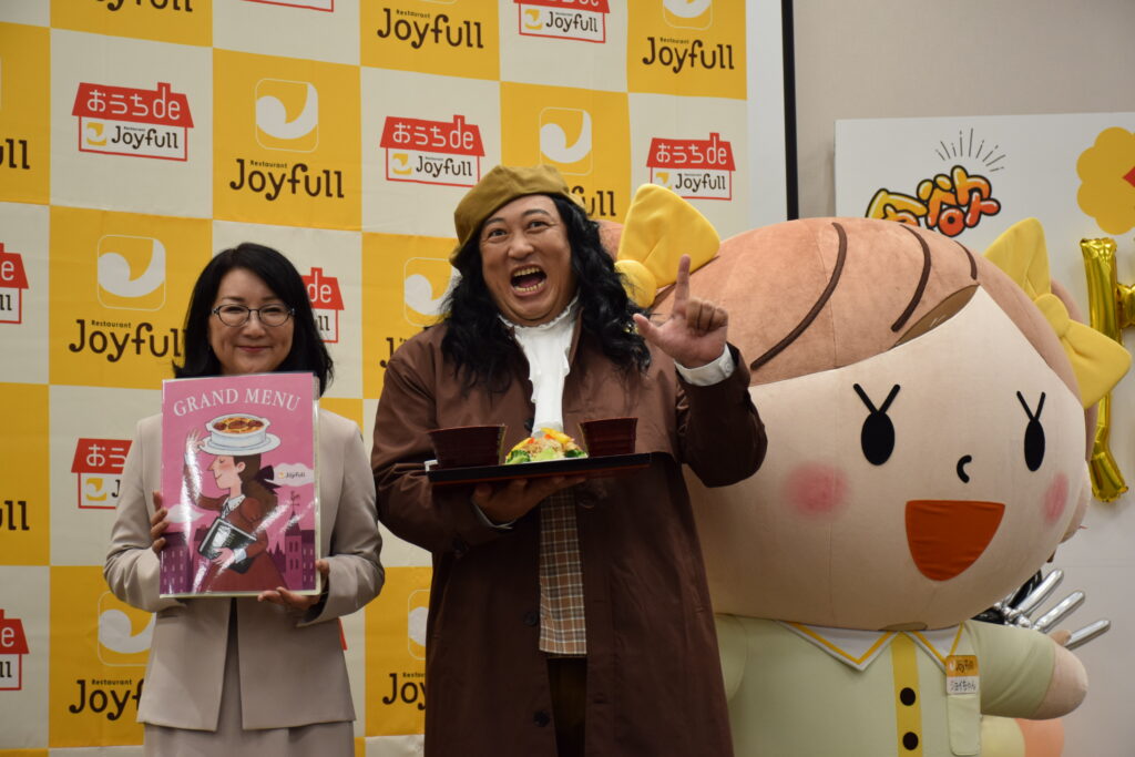 大分県に本社があり、九州を中心に展開するファミリーレストラン『ジョイフル』は、30日から秋冬の新グランドメニューの販売を開始します。福岡県出身で『ジョイフル』と同じ九州地方である秋山さんは、長年『ジョイフル』の宣伝部長を務めています。今回は食の芸術家「食欲の”秋”山」に扮して登場。ベレー帽に芸術家風の衣装で、「みなさん芸術しているかい? 芸術を楽しんで素晴らしい時間を過ごしましょう」とあいさつしました。