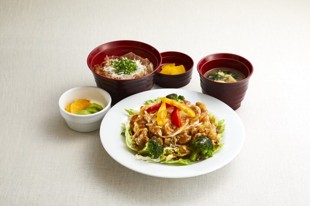 『野菜たっぷりチキンの⻯田揚げと釜揚げしらす丼』(税込¥1,142)は、カリッとジューシーな肉汁溢れるチキン&フレッシュ野菜、ビタミンDが豊富な釜揚げしらす丼、フルーツ&ヨーグルトも付いて栄養バランスは抜群! お腹いっぱい食べたいけど健康も気にしたい方へおススメです。