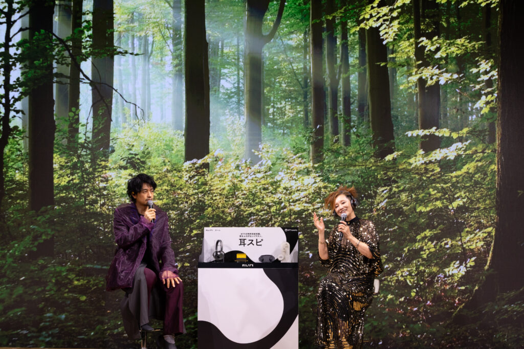 発表会には、ブランドアンバサダーを務める俳優の斎藤工さんと夏木マリさんがゲストとして登場しました。実際に『nwm ONE』を使って会場で音楽を聴いた夏木さんは、「音楽もしっかり聴こえて、みなさん(報道陣)のシャッター音まで聞こえます!」と感動。