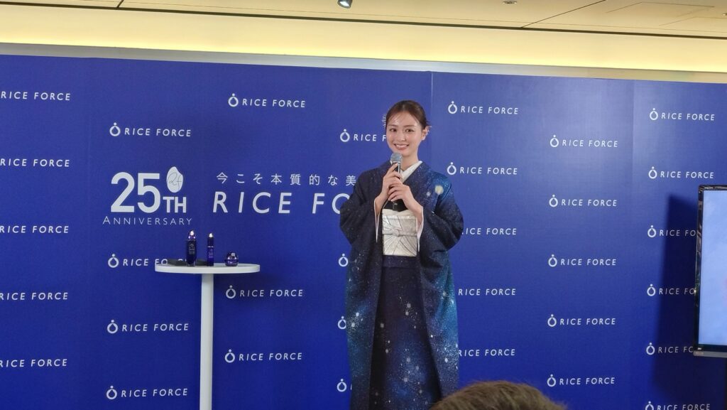 さらに「実は母から連絡があって、『人生で一番好きな化粧水がライスフォースなの』と。すごく喜んでいました」と、母娘で愛用しているエピソードを明かし、会場を和ませました。