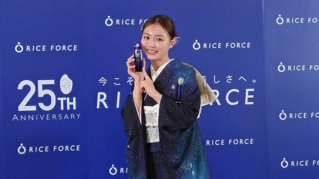 お気に入りのライスフォース製品については、「化粧水が大好きです。とろっとしているのに、お肌にぐんぐん入っていく感じが病みつきになります」とコメント。ドラマの撮影現場でも多くのメイクアップアーティストが使用しているといい、「現場に置いてあると安心感があります」と絶大な信頼を寄せました。