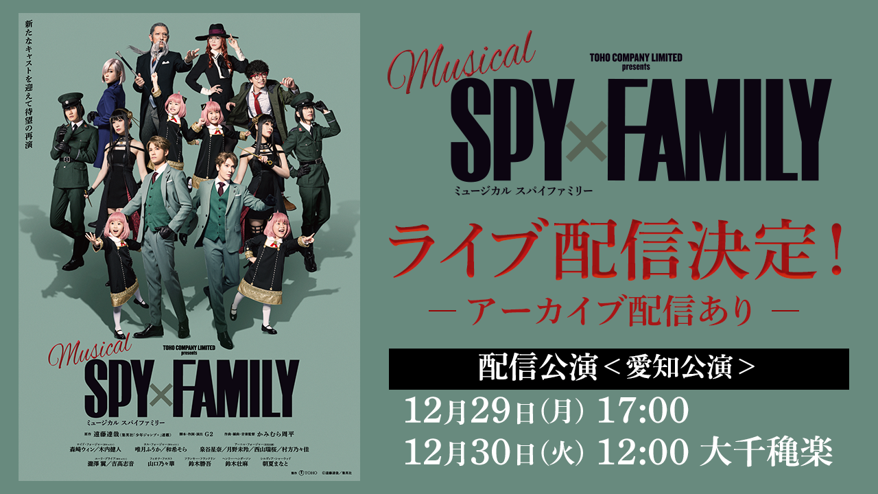 東宝株式会社は11月30日、現在全国ツアー上演中のミュージカル『SPY×FAMILY』について、愛知公演(御園座)での2公演をLIVE配信することを発表しました。配信されるのは、12月29日(月)の公演と、12月30日(火)の大千穐楽公演です。