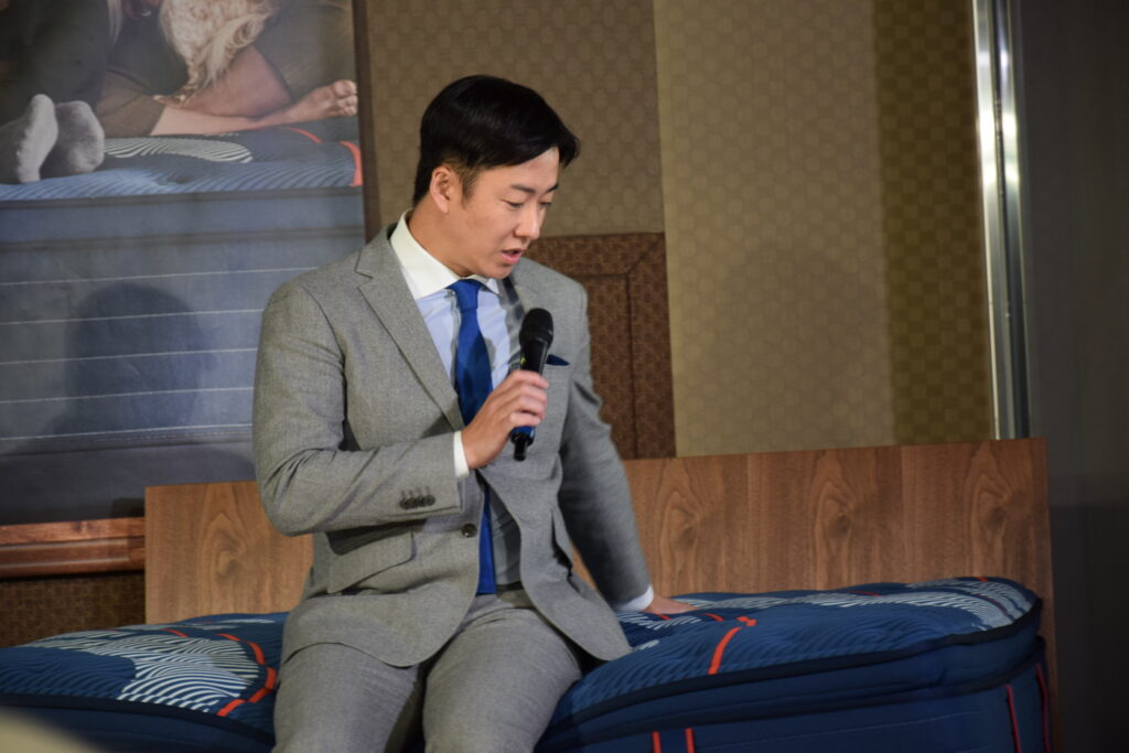 現役時代から『SEALY』を愛用しているという斎藤氏。「現役時代から腰を痛めがちだったんです」と語り、「なぜかというと、寝た時に(マットレスに)腰だけ沈んじゃう。でも『SEALY』のマットレスに変えてからは、腰部分のサポートがしっかりしていて突き上げてくれる。最初は柔らかいんですけど沈み込みすぎない。そのあたりのサポートがすごく優秀だなと感じました」と『SEALY』を絶賛しました。
