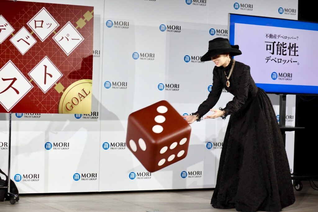 トーク終盤では、北川さんが大きなサイコロを振って止まったマスの質問に答える『森トラすごろく』も行われました。『可能性デベロッパー森トラスト』の12マスが書かれた巨大なすごろくパネルが登場し、それぞれのマスに用意されている質問に北川さんが答えていきました。