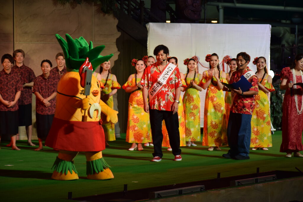 この日は、50周年記念に誕生したハワイアンズの象徴であるキャラクター『CoCoネェさん』に続く、60周年記念の新キャラクター・パイナップルの妖精『パナシバくん』もお披露目されました。