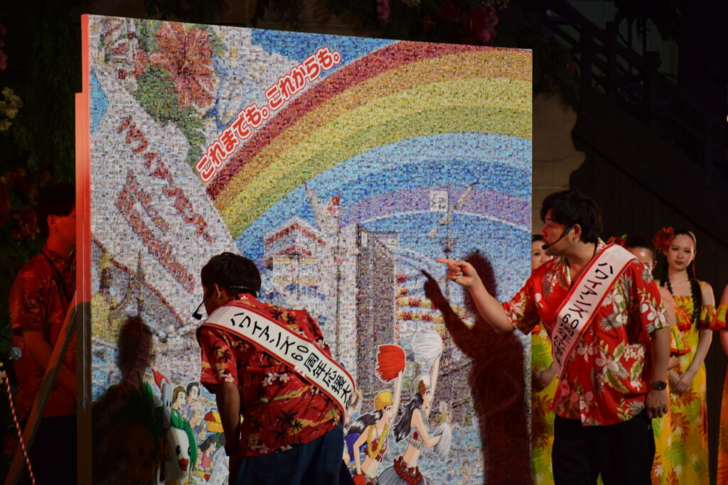 さらに、創業60周年記念の『モザイクアート』の除幕式も行われ、これまでのハワイアンズの歴史やファンの笑顔を集めて制作された巨大なアートがお目見えしました。