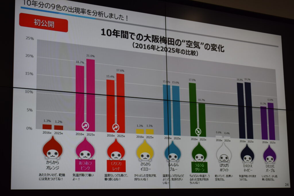 看板が蓄積してきた10年間のデータを分析した結果、驚くべき事実も判明しました。夏の暑い時期が長期化しており、高温多湿を示す「じりじりレッド」や「あつあつピンク」の出現率が増加。逆に、快適な状態を示す緑色の表示が減少傾向にあるといいます。