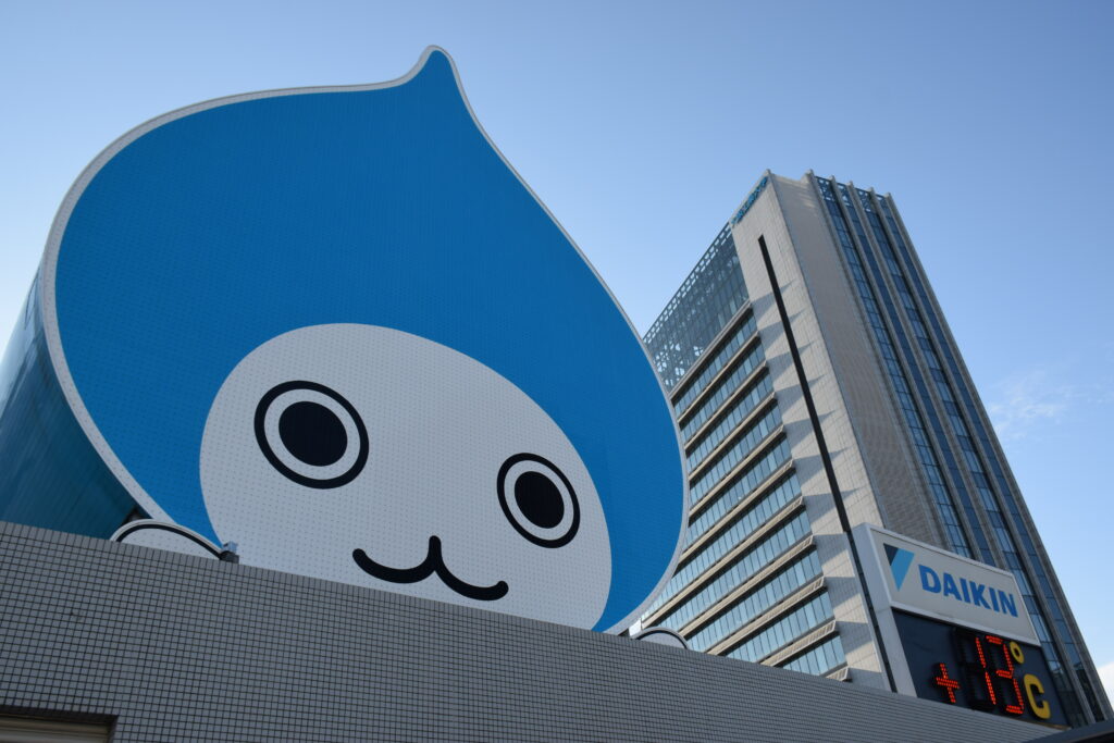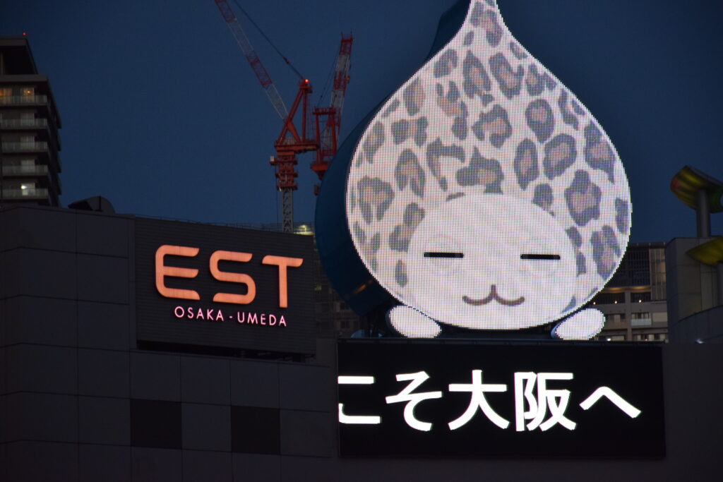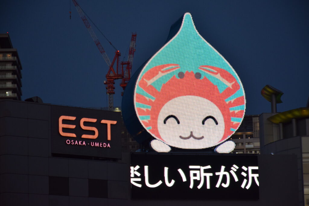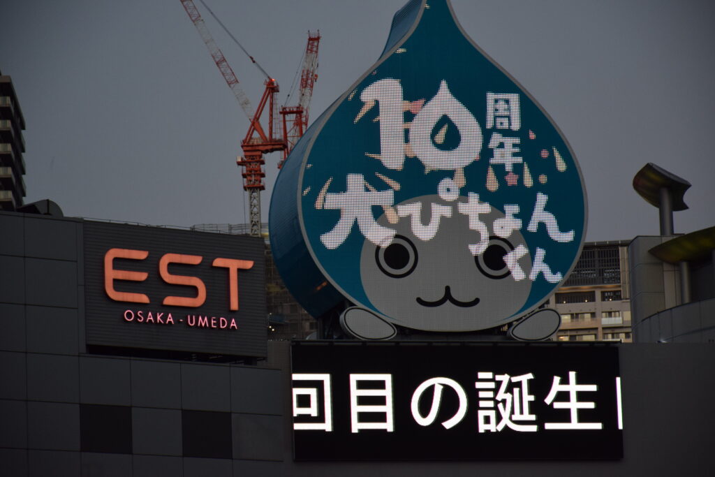 大阪・梅田のシログチビル屋上に鎮座する、ダイキン工業株式会社の”うるるとさらら”のキャラクター『ぴちょんくん』を模した巨大看板『大ぴちょんくん』。