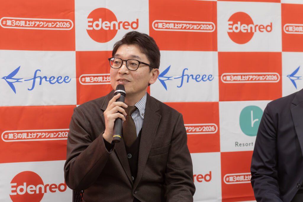 エデンレッドジャパンの天野社長は、「福利厚生活用における地域格差の解消を実現すべく、福岡県で取り組みを強化したい」と語り、「賃上げ疲れから守り抜く、実質手取りアップと持続可能な賃上げを」というスローガンのもと、福岡県内の企業を対象に「#第3の賃上げ福岡アクション」を実施する理由を説明しました。