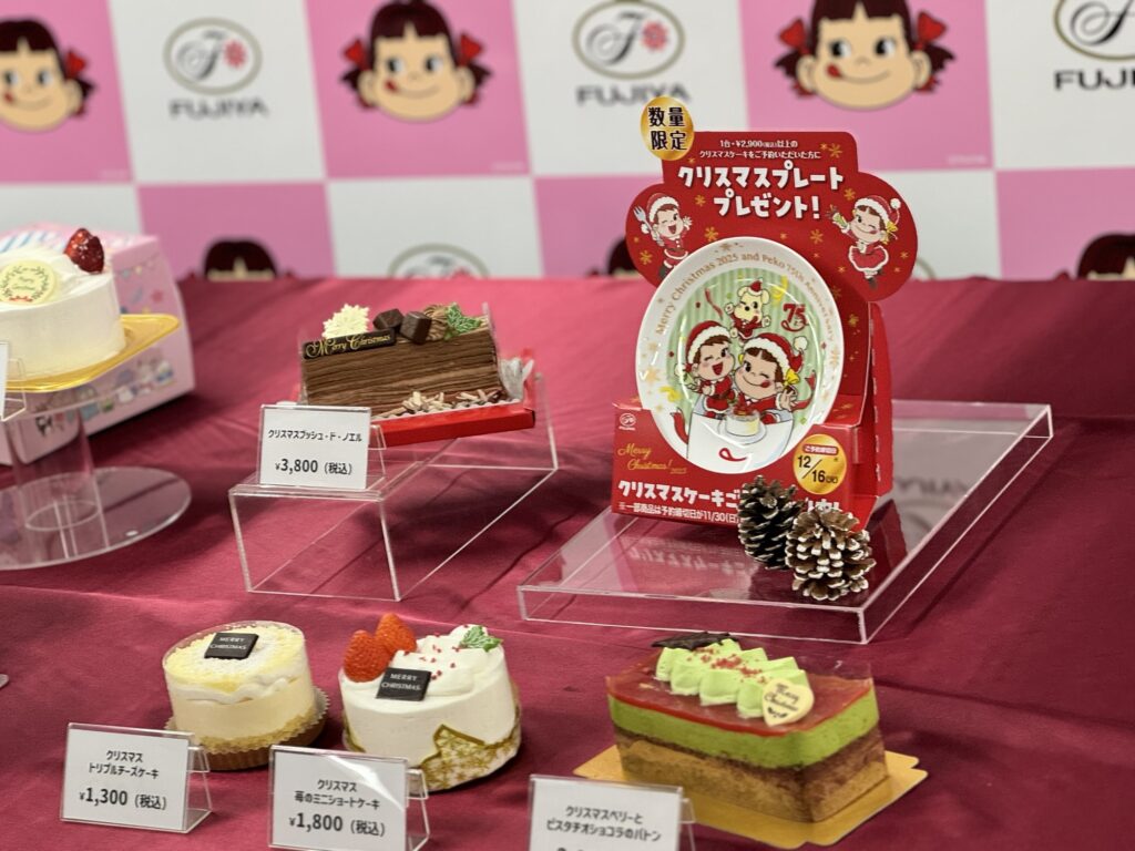 毎年恒例のクリスマスケーキ予約特典として、今年は「2025年クリスマスプレート」がプレゼントされます 。税込2,900円以上のクリスマスケーキを1台予約したお客様が対象で、ペコちゃん、ポコちゃん、ドッグが描かれた限定デザインで、ペコちゃんの生誕75周年ロゴも入っています 。予約期間は10月1日(水)から12月16日(火)までで、数量限定のため、早めの予約がおすすめです 。