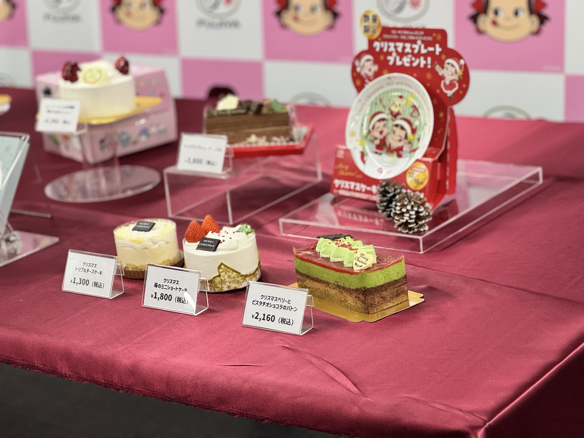 • 「クリスマスはぴだんぶいショートケーキ」:サンリオの男のコキャラクターユニット「はぴだんぶい」とのコラボケーキです。ペコちゃんと「はぴだんぶい」が描かれたペーパープレートとアクリルスタンドが付き、パーティーを楽しく演出してくれます。価格は税込4,968円です 。