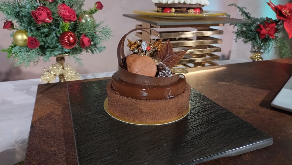 「野生味のある強いカカオ感」が特徴ですが、クリスマスケーキとして家族みんなで楽しめるよう、あえてミルクチョコレートをブレンドし、マイルドかつ奥深い味わいに仕上げています。層になったキャラメルクリームや、アクセントのヘーゼルナッツのキャラメリゼが織りなすハーモニーは絶品です。