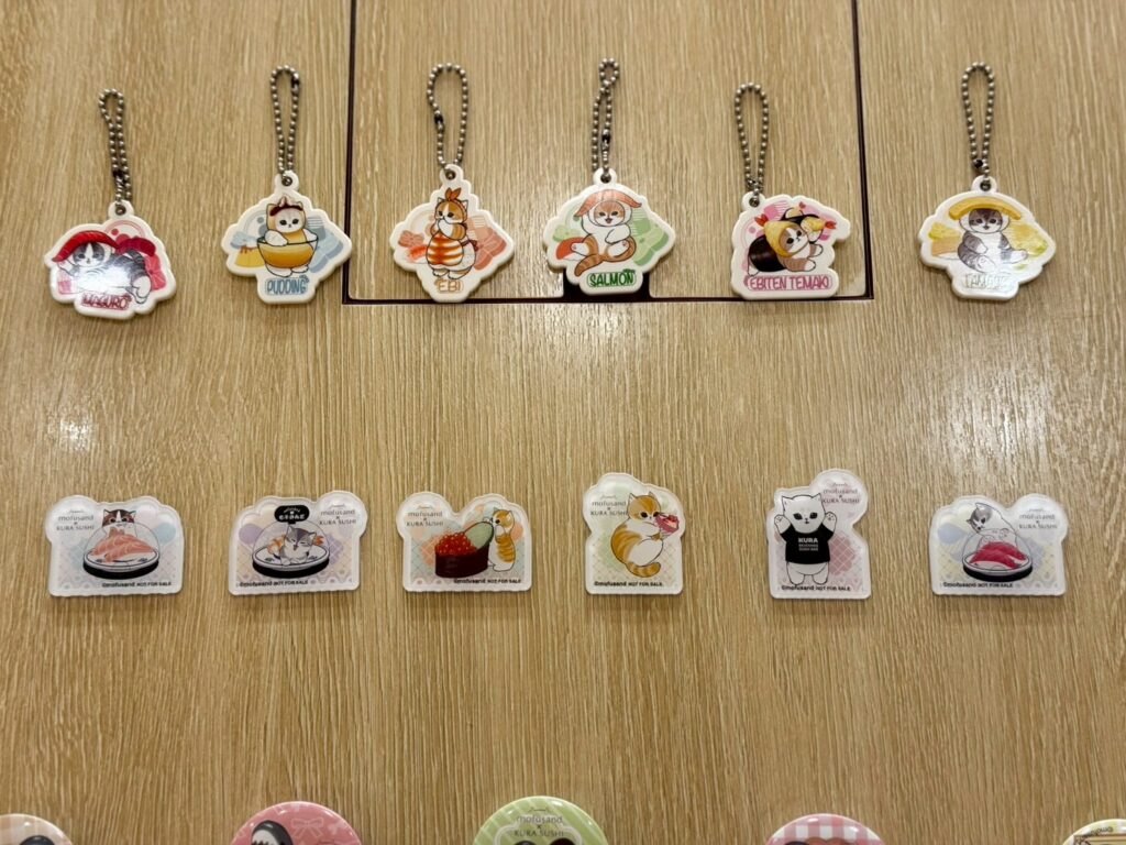 寿司皿を5枚入れると挑戦できる『ビッくらポン!®』に、mofusandのオリジナル動画(全3種)が登場。当たりが出ると、くら寿司のメニューを身にまとったにゃんこの「ラバーチャーム」や「缶バッジ」などがもらえます。