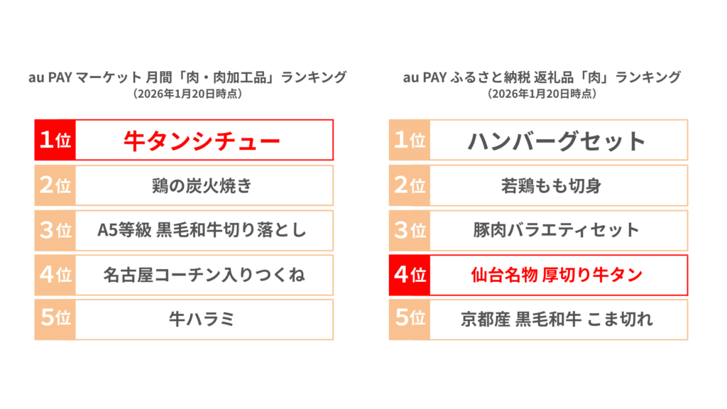また、よく購入されるカテゴリーでは「精肉・ハム・ソーセージ(38.0%)」がトップ。中でも「牛タン」は、お取り寄せの定番であるステーキ肉などを抑え、『au PAY マーケット』のランキングで1位を記録するなど、高い人気を博しています。
