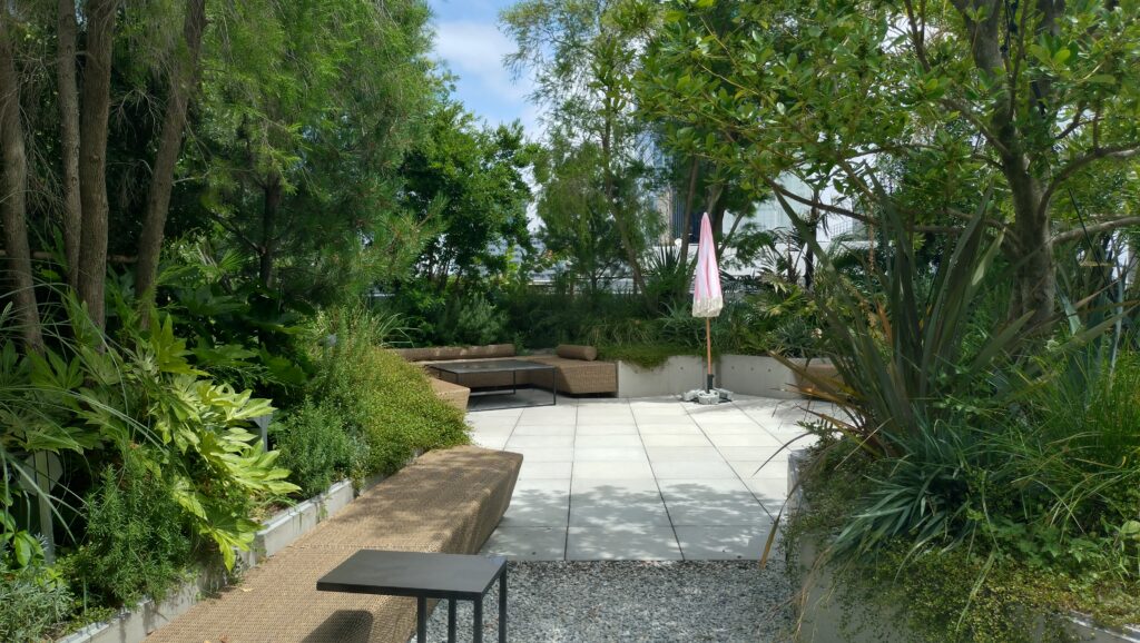 屋上からは原宿の街を見おろすことができ、眺めも最高! ミストが噴出される緑いっぱいの空間でアイスを食べることができますよ。