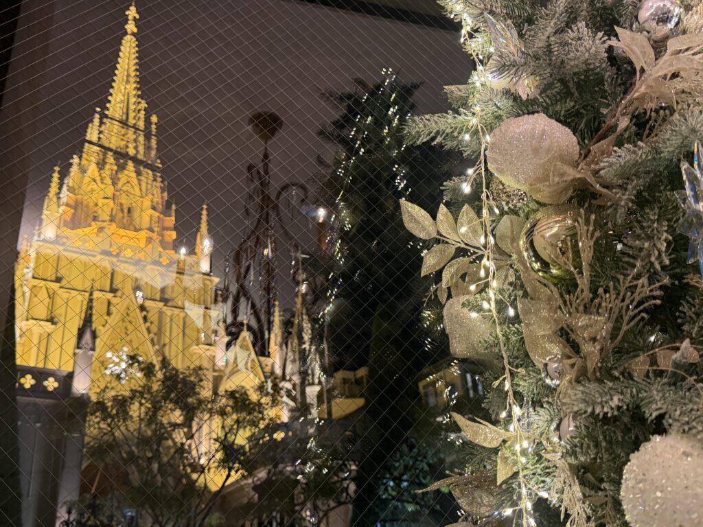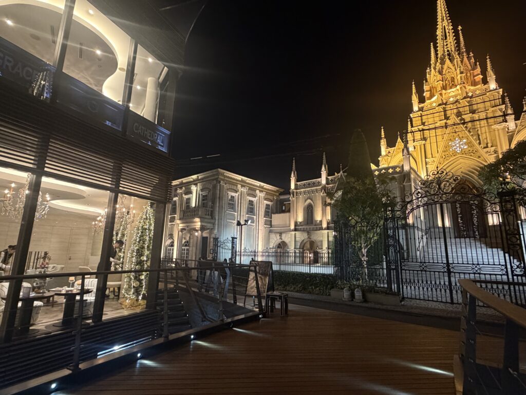 日が落ちると、大聖堂は幻想的なライトアップに包まれます。レストラン内の照明もトーンを落とし、キャンドルの火が揺らめく大人の社交場へと一変。