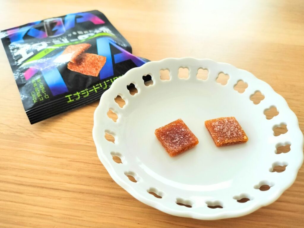 実際に食べてみると、噛むたびにじゅわっとエナジードリンク味が染み出てきて、1粒を最後までおいしくいただけました。噛むという口の運動が加わることで、ただエナジードリンクを飲むよりも気分転換やリフレッシュにつながりそうだなとも思いました。お昼休憩後のお仕事の前や、集中したいときなどにオススメです。