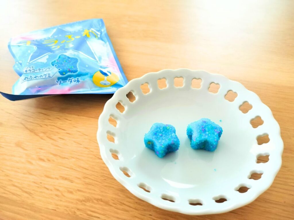 実際に食べてみると、マシュマロのふわっとした弾力のあと、シャリシャリとした心地よい食感が楽しめ、甘みと酸味の絶妙なバランスもたまりません。グミ本体の鮮やかなブルーも印象的で星の形もかわいらしく、キラキラとちりばめられたコーティングは見ているだけでも夢見心地にさせてくれました。