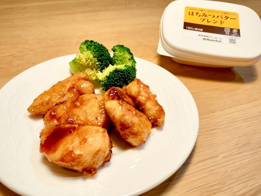 編集部はこの『はちみつバターブレンド』を使った”照り焼きチキン”にトライ! 下味でいくつか調味料は使いますが、味付けはしょうゆと『はちみつバターブレンド』のみというシンプルさです。