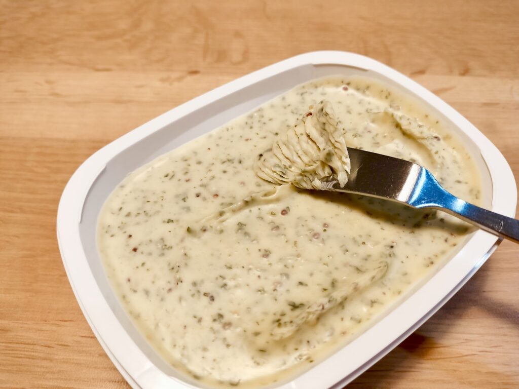 こちらは、実際のフレンチレストランのレシピをベースに設計された逸品で、バターと生クリームをブレンドした柔らかいマーガリンに、塩、胡椒、すりおろしたエシャロットとガーリック、粒入りマスタード、アンチョビ、エストラゴン(タラゴン)、パセリなどを混ぜ合わせた調味素材です。