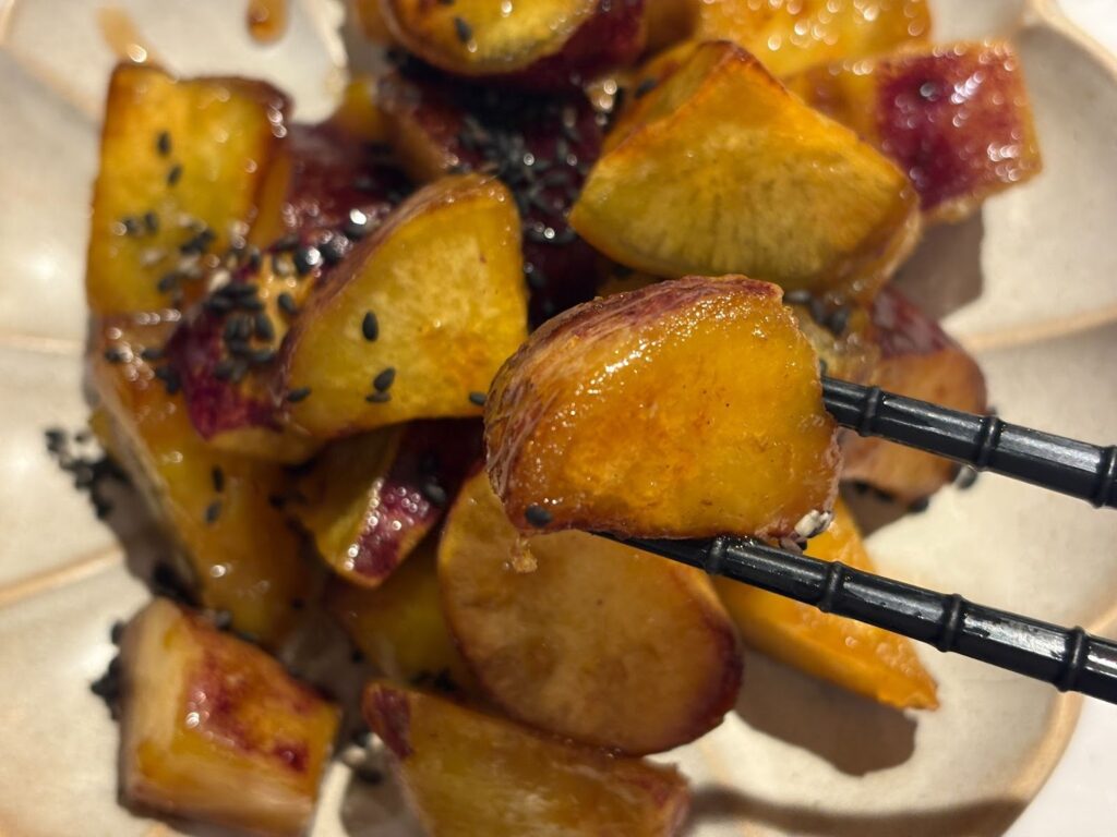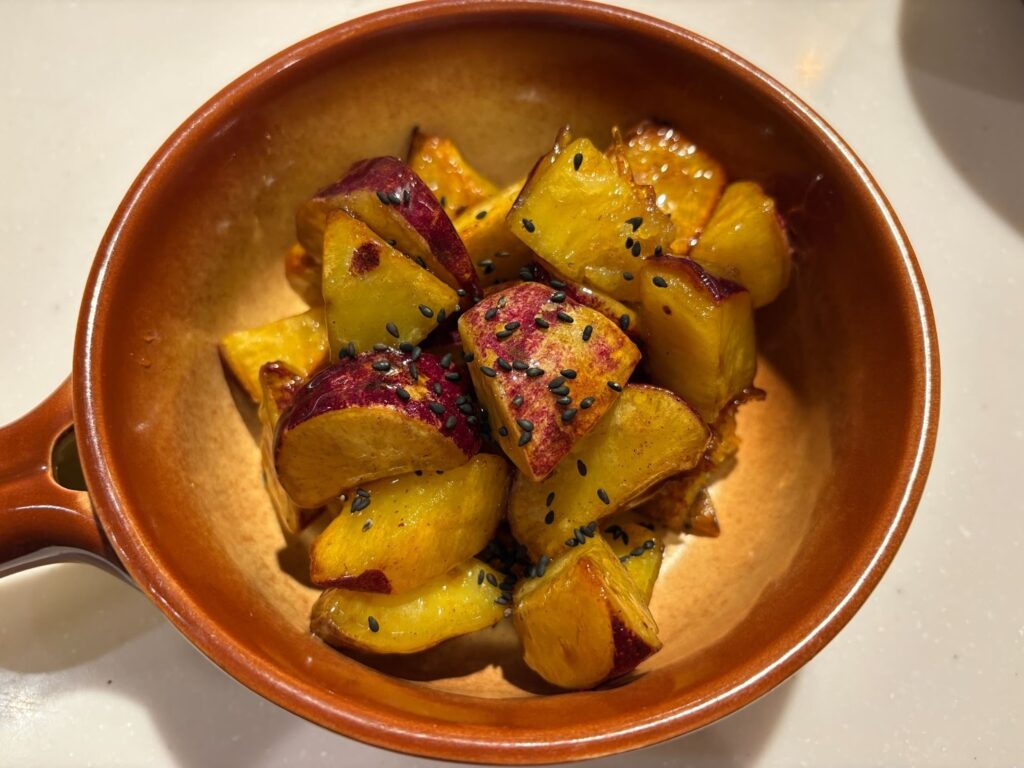4.揚げ焼きにしたさつまいもと1のタレを絡め、黒ゴマをふれば完成です。