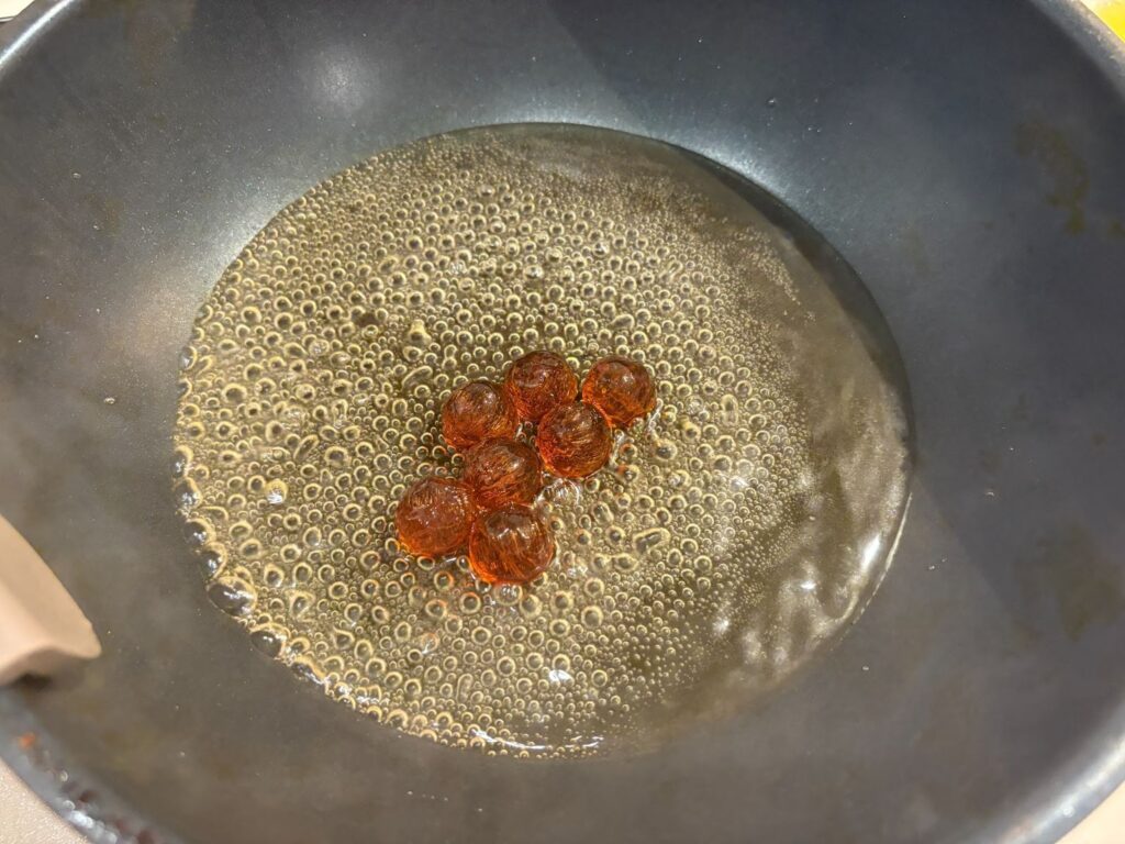1. カンロ飴7個と水150mlを鍋に入れて火にかけ、溶かして煮詰めます。