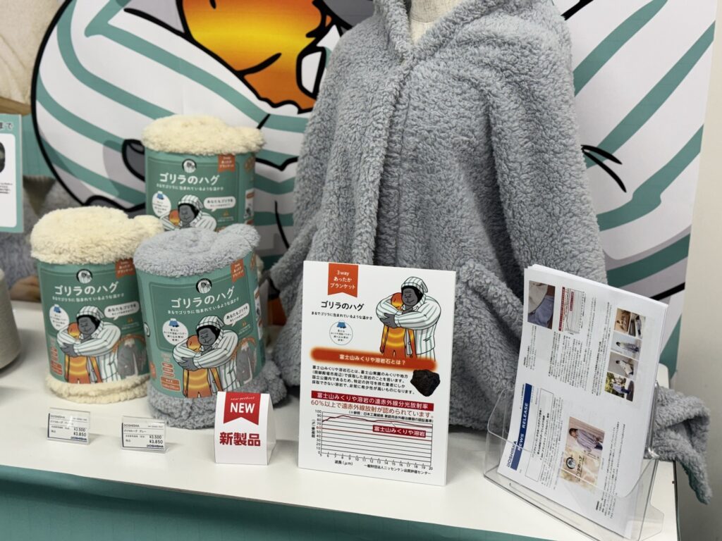 最大の特徴は、「富士山みくりや溶岩パウダー」を繊維に練り込んでいる点です 。富士山のふもとの国立公園内では特別な許可を得ないと岩は持ち帰れません。そこから採取された希少な溶岩パウダーを使用しており、この素材には遠赤外線放射効果が認められています 。これにより、まるでゴリラに包まれているような、じんわりとした温かさを実現しました 。