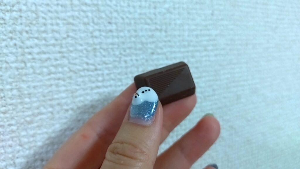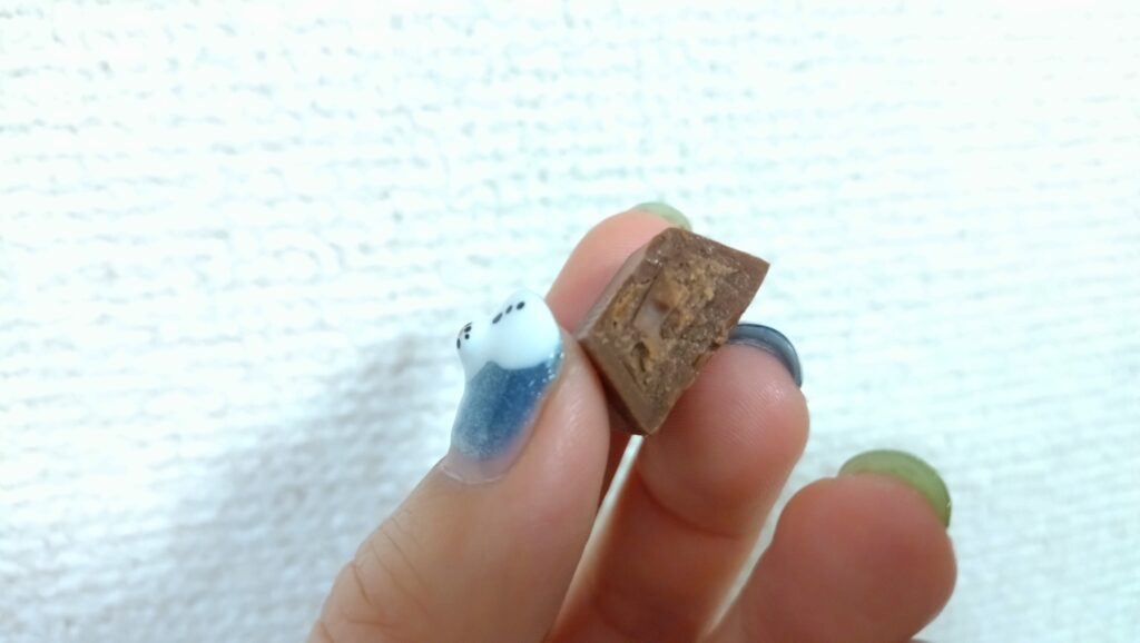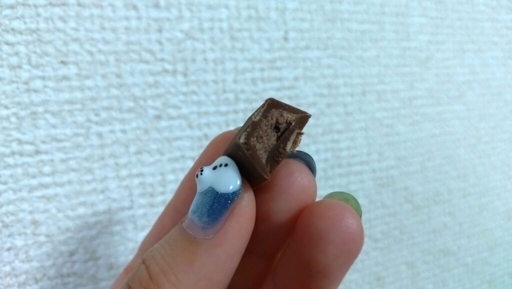 内側のチョコレートもパキパキ食感です。硬めなので“チョコレートっぽい”ですが、通常のチョコレートの『ダース』の口当たりとも違う、そしてもちろんアイスとも違う、独特の冷凍食感を楽しむことができます。