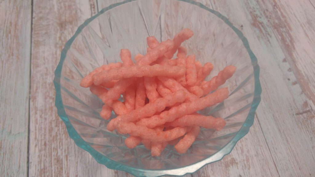 『かっぱえびせん』の色も、春らしい桜色。見た目もかろやかで美しいです。